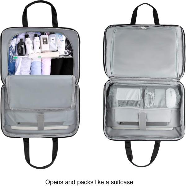 Roomy space with 1 waterproof toiletry pocket, 1 shoe bag/laundry bag; Business zone: 1 padded 15.6" laptop compartment, 1 dedicated 10.5" tablet pocket, a file section and multiple accessory compartments